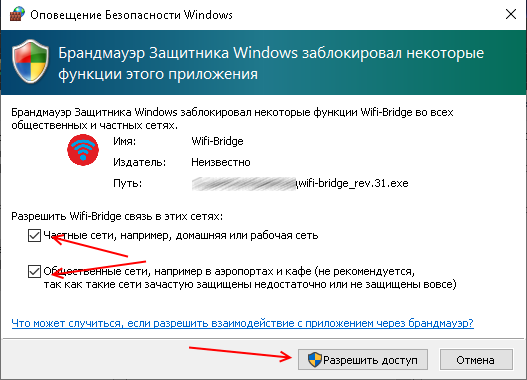 Если отключить нет возможности, то при первом запуске программы WiFi-Bridge необходимо добавить её в исключение брандмауэра: