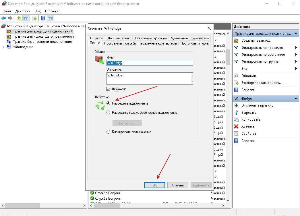 Если при первом запуске разрешение дано не было и окно с запросом не появляется, то необходимо вручную добавить WiFi-Bridge в исключение брандмауэра: